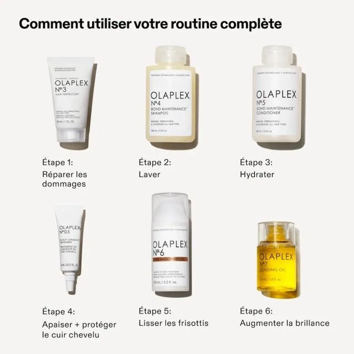 Coffret en édition limitée pour des cheveux forts, brillants et visiblement sains dès la première utilisation, avec un cuir chevelu soigné et hydraté. Six formats voyage dont deux produits full-size : Le Sérum traitement de longévité du cuir chevelu No.0.5 5ml pour soigner, hydrater et apaiser la barrière et le microbiome du cuir chevelu. Le Soin Avant-Shampoing Perfecteur de cheveux No.3 30 ml pour reconstruir les liaisons capillaires. Le Shampoing Bond Maintenance No.4 100 ml pour réparer les pointes tout en nettoyant en douceur. Apporte hydratation et brillance à chaque lavage. L'Après-Shampoing Bond Maintenance No.5 100 ml pour hydrater et démêler les cheveux sans les alourdir. Formulation riche en actifs hydratants. La Crème coiffante sans rinçage No.6 100ml (format standard) pour protéger, discipliner les cheveux et les frisottis. L' Huile concentrée réparatrice No.7 30 ml (format standard) pour nourrir les cheveux et améliorer leur brillance. Ces 6 produits sont issus de la gamme professionnelle Olaplex et formulés avec la technologie brevetée Olaplex Bond Building™. Résultats visibles dès la première utilisation. Adapté à tous les types de cheveux. Catégories : CHEVEUX › CREME & LOTIONS › SERUMS. Fiche boutique : https://lepapsluxury.dz/boutique/cheveux/serums/olaplex-the-full-on-shine-kit-holiday-2025/ SKU fournisseur : 0850056933971 Stock (site) : 2 en stock